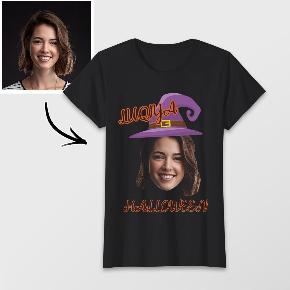 50% RabaisT-shirt De Visage Personnalisé Cadeaux T-shirt Avec Nom De Photo Avec Chapeau De Sorcière Blanc -