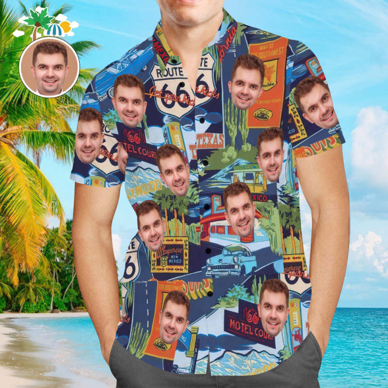 Chemise Hawaïenne Personnalisée Avec Visage Route 66 Monuments Aloha Beach Shirt Cadeau Pour Lui