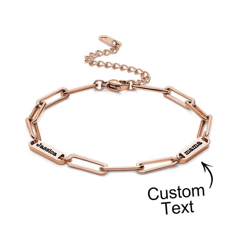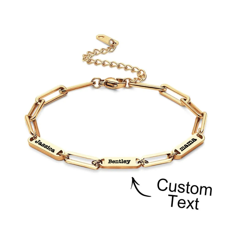 Faites savoir à maman et à grand-mère à quel point elles comptent en leur offrant un bracelet avec prénoms personnalisés ! Choisissez parmi trois teintes audacieuses et gravez jusqu'à sept noms. Bracelet de connexion à joint de forme carrée construit en acier inoxydable pour une tenue durable. Célébrez la famille avec un cadeau inoubliable !