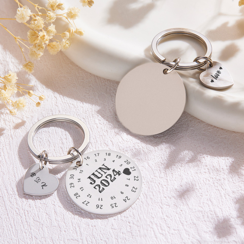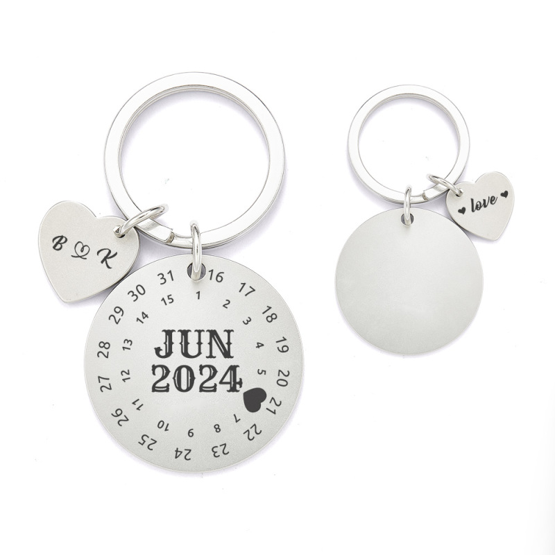 Ces porte-clés calendrier sont une merveilleuse façon de se souvenir de la date spéciale d'un anniversaire, d'un mariage ou même d'un premier rendez-vous ou d'un baiser. Ils peuvent être personnalisés des deux côtés. Un côté peut être gravé avec le mois civil que vous choisissez avec votre jour spécial marqué. L'autre face peut être gravée avec les images.