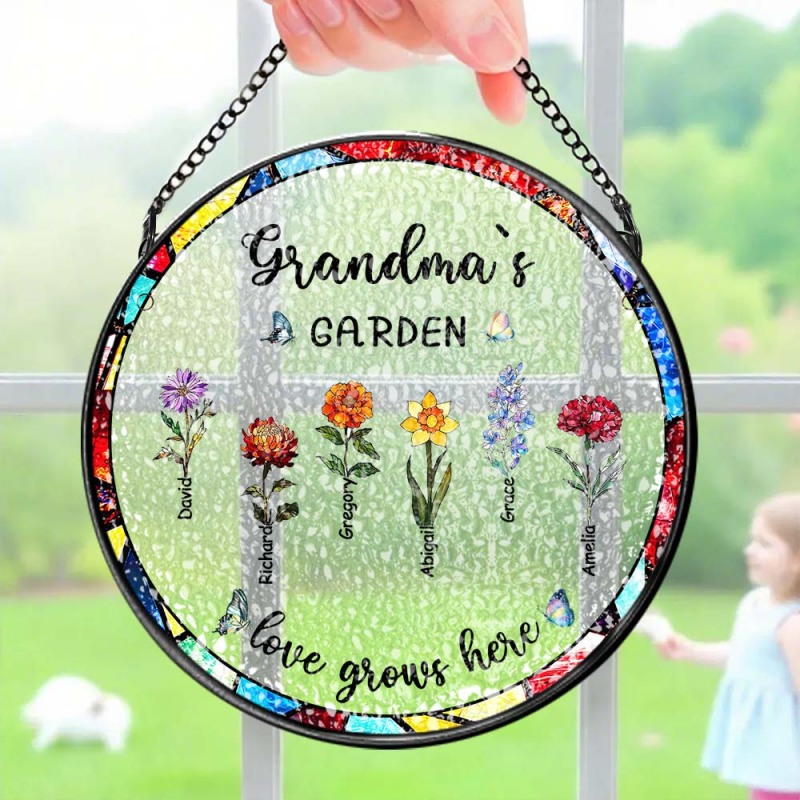 Apportez chaleur et couleur à un espace précieux avec un attrape-soleil en verre personnalisé « Fleurs d’anniversaire » : un souvenir personnalisé et ensoleillé qui célèbre la famille, les anniversaires et la beauté du jardin de grand-mère.