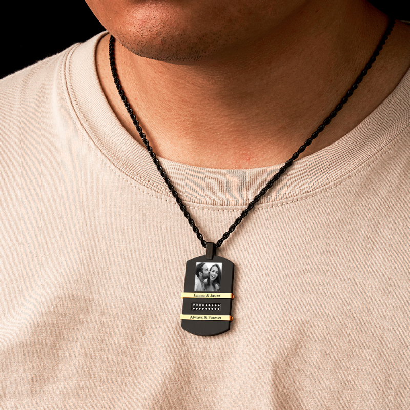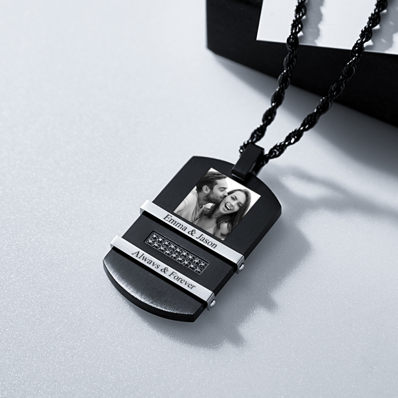 Collier noir personnalisé avec photo à l'intérieur pour homme : gravez la photo de votre proche sur ce pendentif avec votre texte personnalisé. Parfait pour les couples, les familles, les filles, les pères, les fils, les frères, les sœurs, les équipes ou les meilleurs amis.
