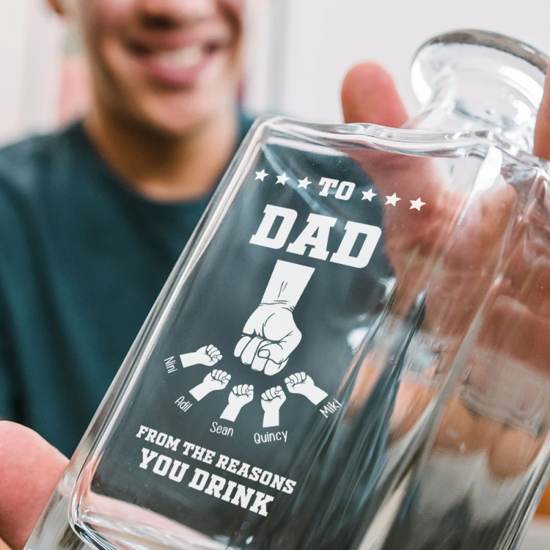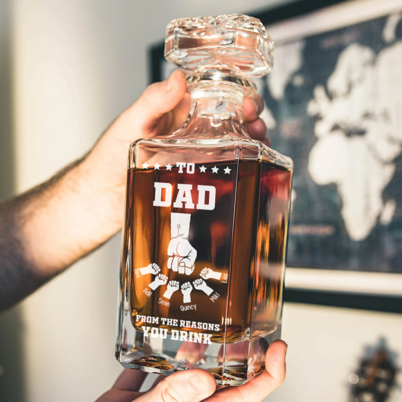 Offrez à papa un cadeau aussi audacieux et inoubliable que son sens de l'humour avec cette bouteille de whisky personnalisée. Ornée de la phrase amusante « À papa, des raisons pour lesquelles tu bois » et personnalisée avec les prénoms des enfants, cette bouteille souvenir est à la fois attentionnée et amusante.
