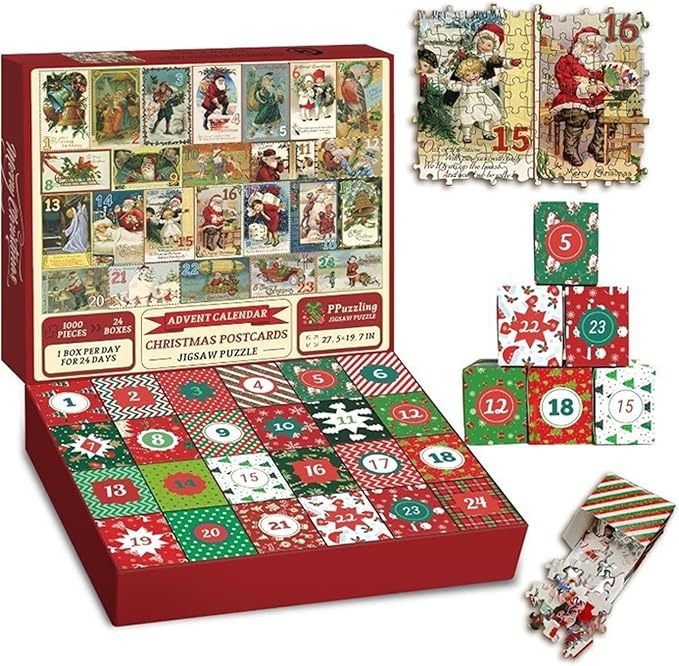 [Ensemble de puzzle de Noël] : ouvrez la boîte, elle contient 1 000 puzzles magnifiquement conçus, intelligemment divisés en 24 petites boîtes, chaque boîte contient de petits puzzles avec des motifs différents et peut être combinée en un grand puzzle complet, vous donnant un sentiment de rituel. Il y a aussi une belle affiche pour référence, et chaque puzzle a un numéro correspondant au dos pour vous aider à restaurer l'apparence d'origine du puzzle. La taille après achèvement est de 27,5 x 19,7 pouces, ce qui est de taille moyenne.
