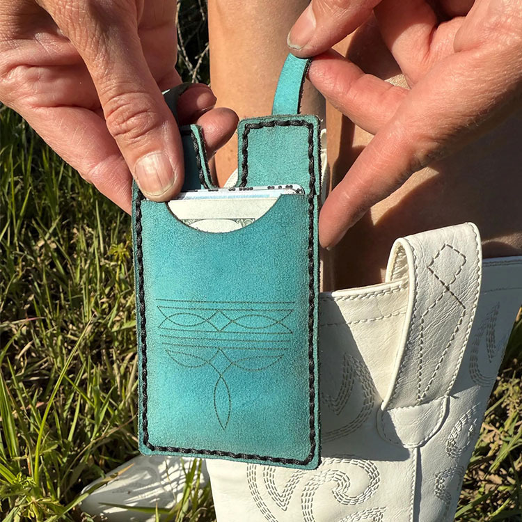 Ce porte-monnaie en cuir pour botte avec fermeture à pression est l'accessoire western idéal pour les rodéos, les concerts, les festivals et les sorties nocturnes. Conçu pour s'enrouler solidement autour de votre botte, il protège votre argent, vos cartes et vos petits objets essentiels tout en vous laissant les mains libres.