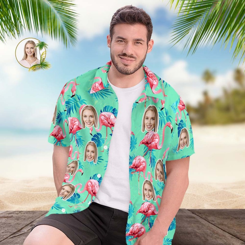 Chemise Hawaïenne À Visage Personnalisé, Chemise Tropicale Flamant Rose Pour Hommes, Imprimé Partout, Feuilles Vertes Et De Palmier