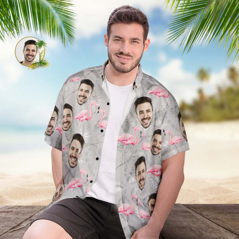 Chemise Hawaïenne Avec Visage Personnalisé Pour Hommes, Avec Photo Décontractée, Imprimé Flamant Rose, Cadeau De Fête De Vacances
