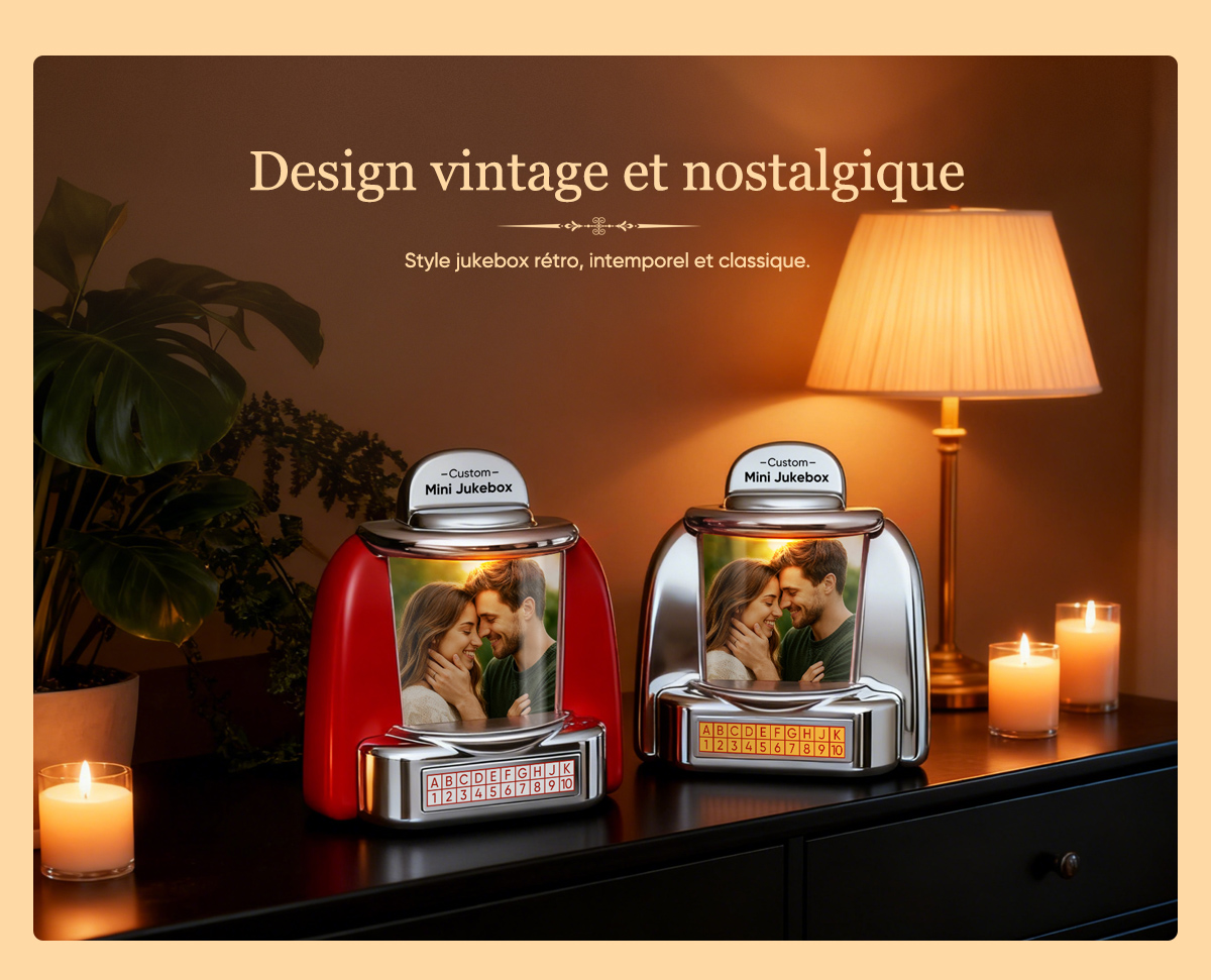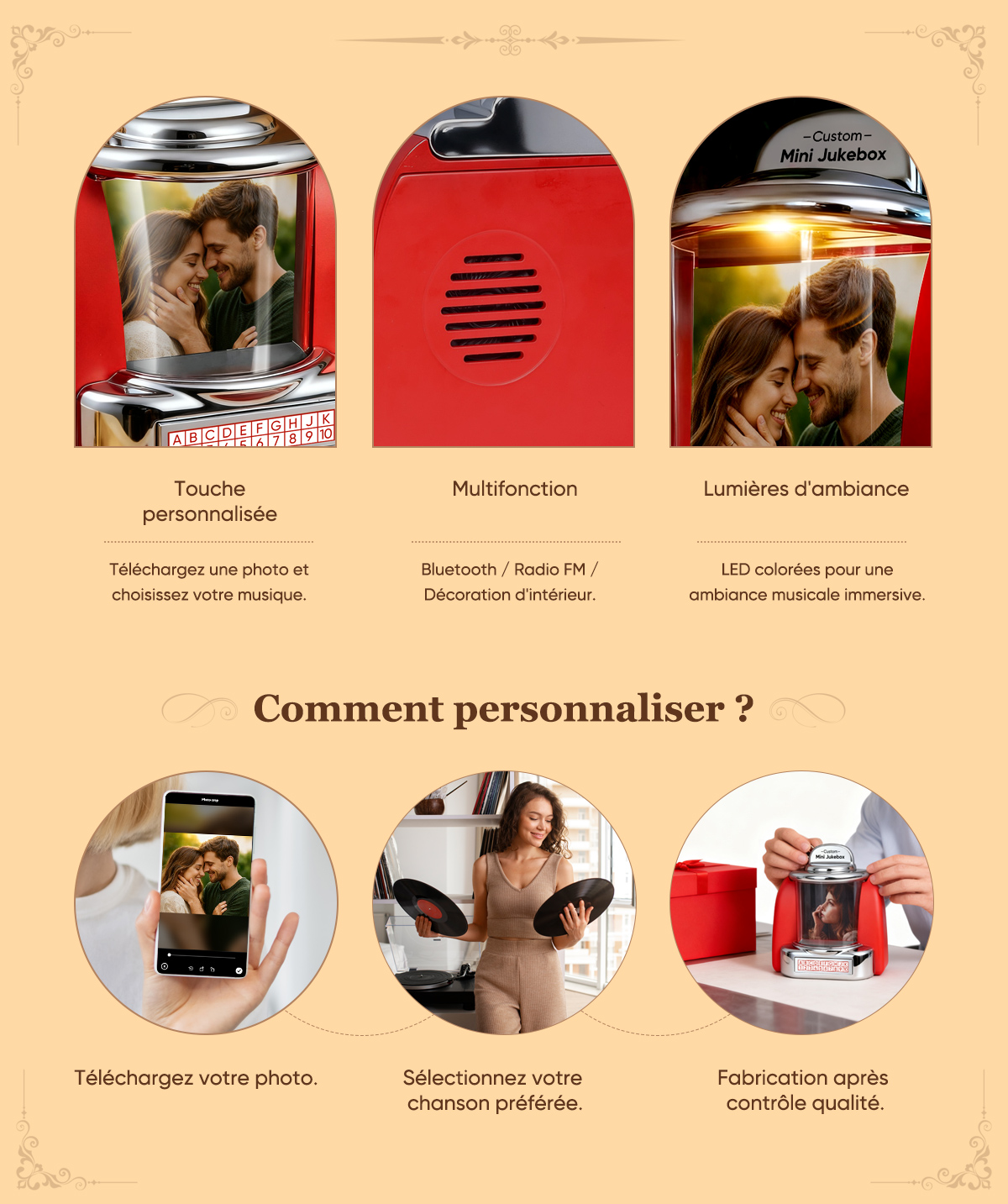 🎵Musique et photo personnalisées : ajoutez vos chansons ou playlists préférées. Affichez la photo de votre choix sur le devant du jukebox.