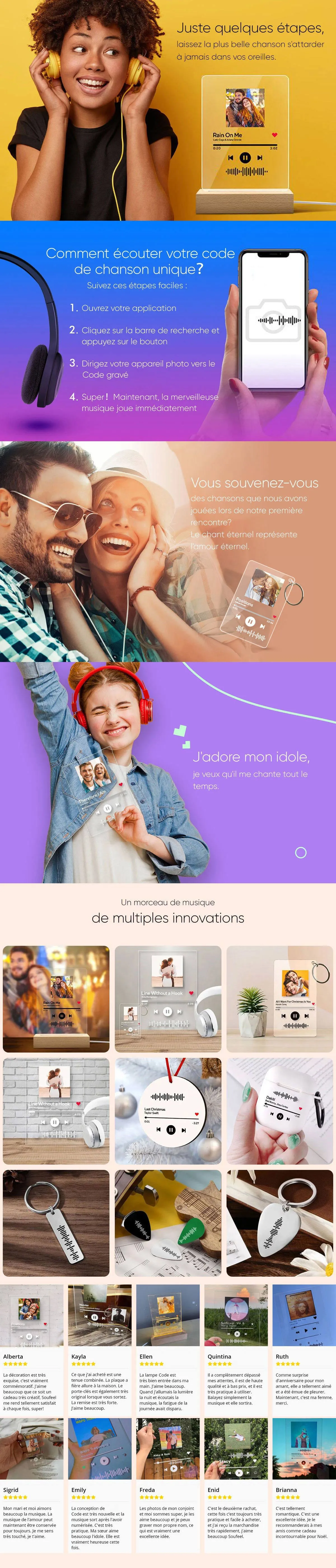 Veuillez choisir une chanson pour personnaliser le porte-clés musical à code musical scannable afin de partager votre chanson préférée avec tout le monde. Nous y ajoutons un code musical ! Une fois que vous avez scanné le code sur l'application musicale, votre chanson commencera à jouer immédiatement.