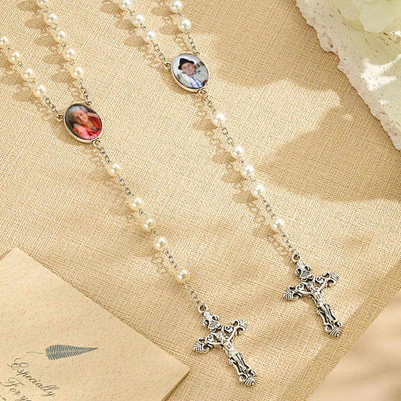 Chapelet Personnalisé Perles Croix Collier Personnalisé Blanc Perles D'imitation Collier Avec Photo