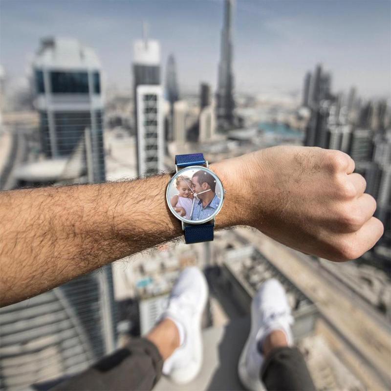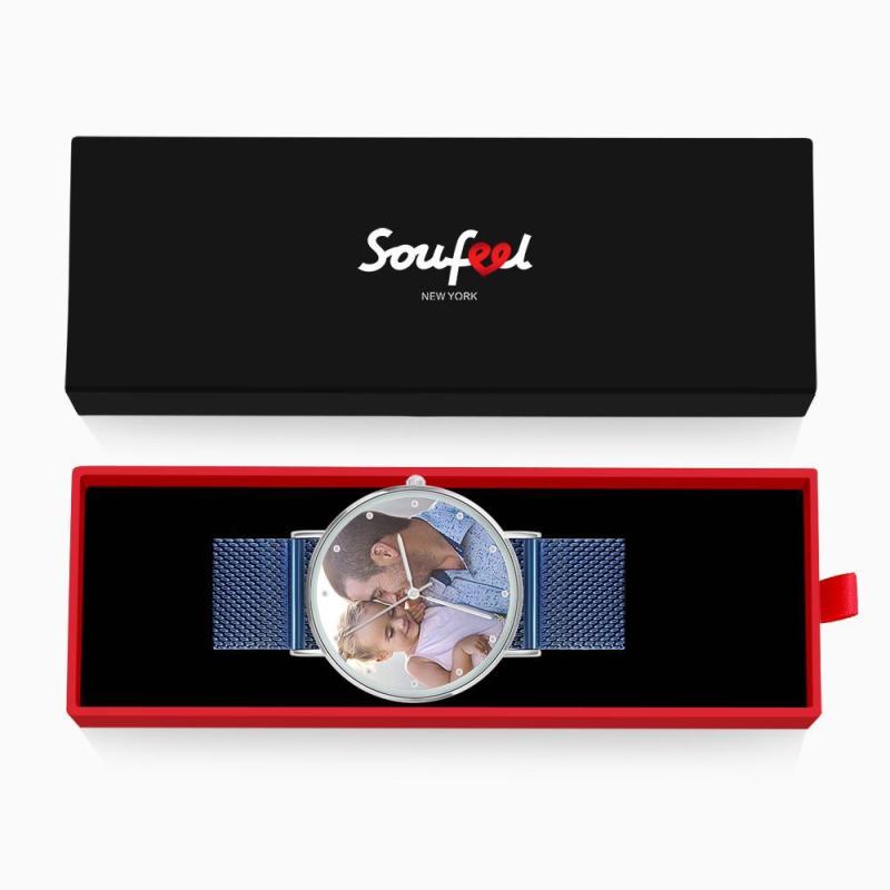 Surprenez votre bien-aimé avec une montre photo personnalisée qui est purement faite sur mesure pour s'adapter à toute personnalité. L'image du dessin est directement imprimée à l'intérieur de la surface de la montre. Une montre photo personnalisée fait toujours un beau cadeau et ne se démodera jamais. Nous pouvons personnaliser l’inverse de la montre avec un message. Gravé avec soin, il rappelle à jamais votre message. Cette montre est notre chef-d’?uvre emblématique, la fusion parfaite entre minimalisme et sophistication. Habillé ou baissé, il est s?r de ponctuer le look et constituera un cadeau parfait pour vos proches, voire un cadeau pour vous-même! Soufeel propose une multitude de bijoux personnalisés à des prix raisonnables et qui constituent d'excellents cadeaux pour toutes sortes d'occasions, comme les anniversaires, les vacances, les anniversaires et la fête des pères. Cadeau pour le Père - Montre Gravée Personnalisée, Personnaliser Votre Propre Montre en Photo avec Bracelet Bleu