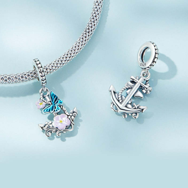 Charm Pendant Ancre Fleur Argent