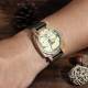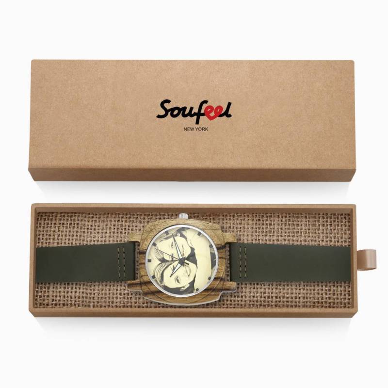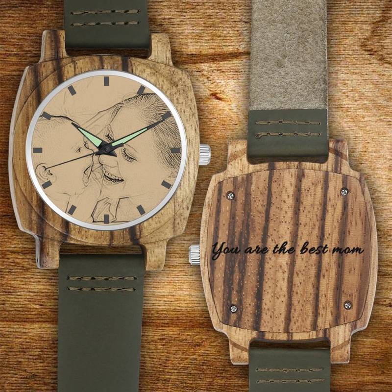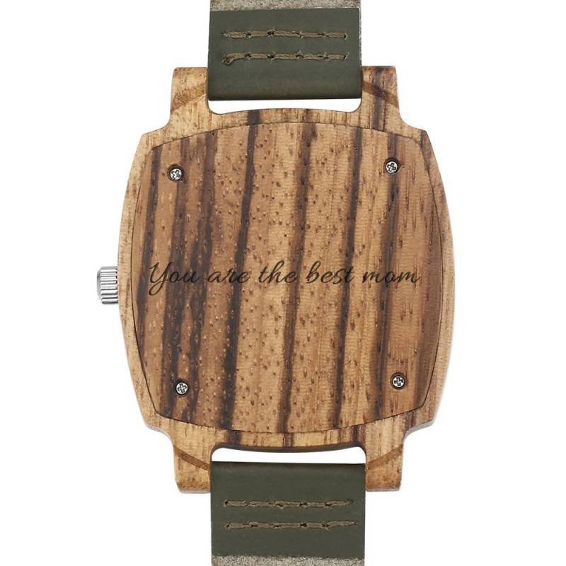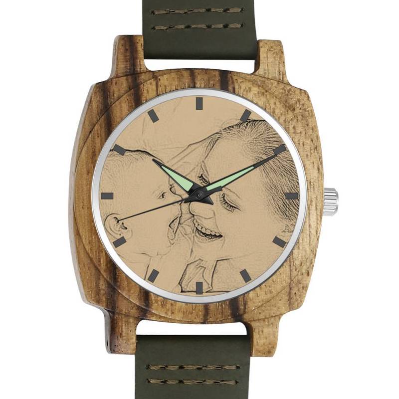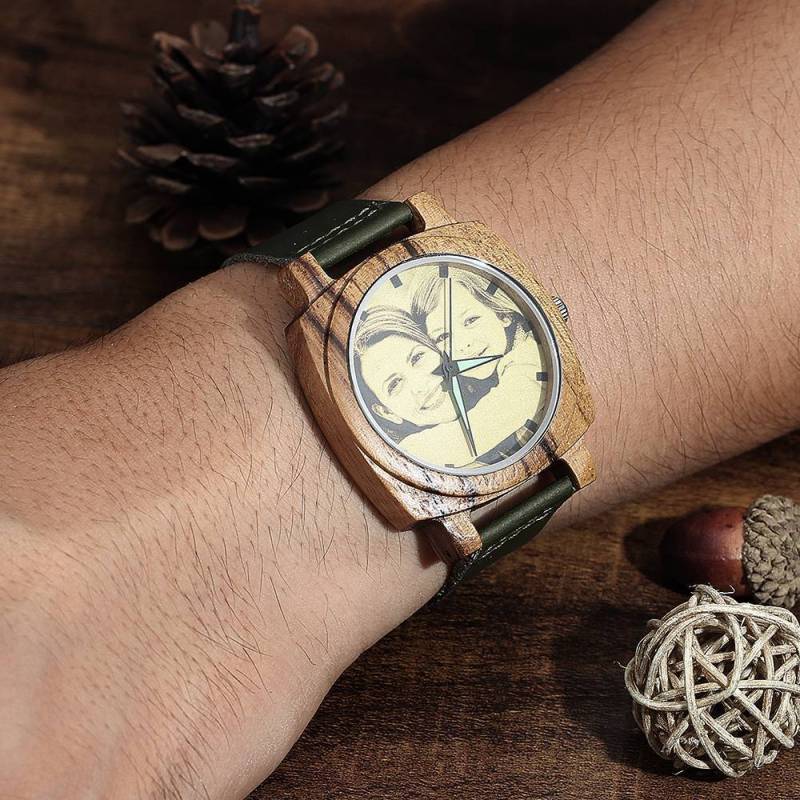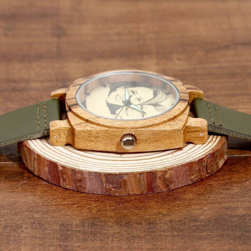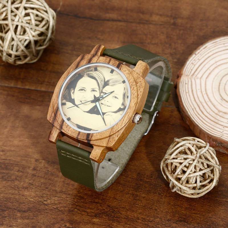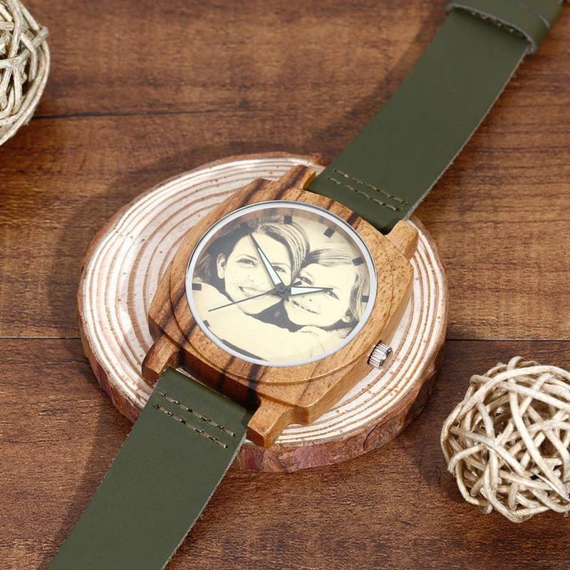 Montre Gravable Photo En Bambou Pour Homme Bracelet En Cuir Vert Foncé 45mm