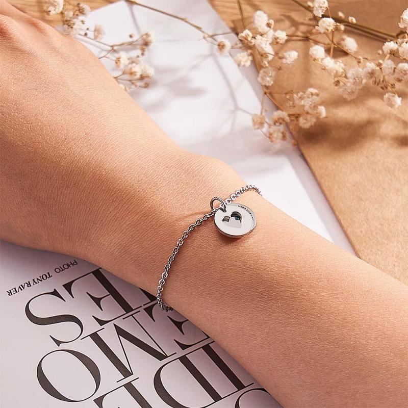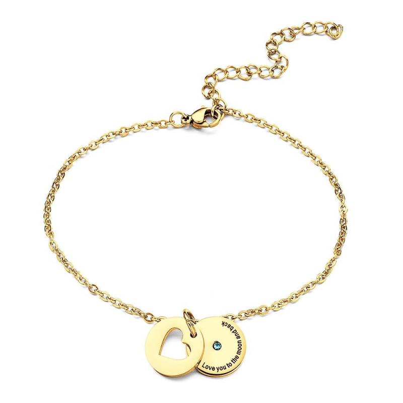 Le bracelet personnalisé avec message secret et pierre de naissance en forme de cœur lui fera sourire à coup sûr ! Ce bracelet personnalisé comprend un disque poli contemporain incrusté d'une délicate pierre de naissance Swarovski en son centre. Le disque est gravé d'un message de votre choix et caché par un cœur parfait qui peut être tourné pour révéler votre message.