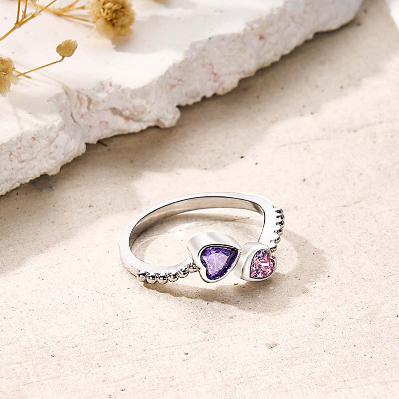 Cette bague avec pierre de naissance personnalisée présente un design ouvert réglable et une forme de double cœur, ce qui en fait un cadeau parfait pour elle. Personnalisez-le avec sa pierre de naissance pour un cadeau vraiment unique et significatif. Fabriquée avec précision et soin, cette bague exprime l'amour et la prévenance dans un bijou magnifiquement conçu.