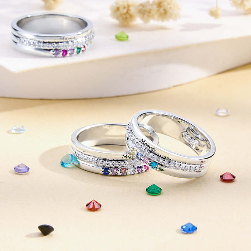 Cette bague avec pierres de naissance personnalisée avec texte gravé est un cadeau d'anniversaire attentionné pour les mamans et les grand-mères. Les pierres de naissance et le texte personnalisables ajoutent une touche personnelle à ce magnifique bijou sentimental. Parfait pour afficher la fierté et l'amour de la famille.