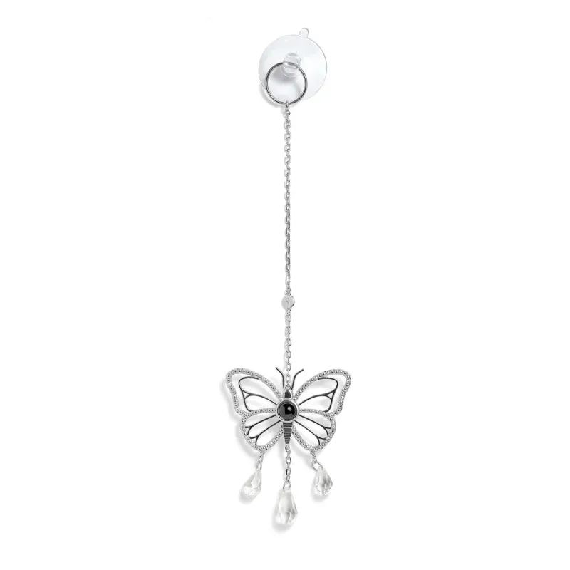 Catch the light-and a treasured moment-with our Personalized Butterfly Photo Sun Catcher. This unique piece features a custom photo gem at the heart of a gleaming, butterfly shaped metal frame. Hanging below it are an array of precision-cut crystals that will fill a room with rainbow prisms when it catches the light. One glance and your favorite face or memory glows at the heart of a miniature rainbow.