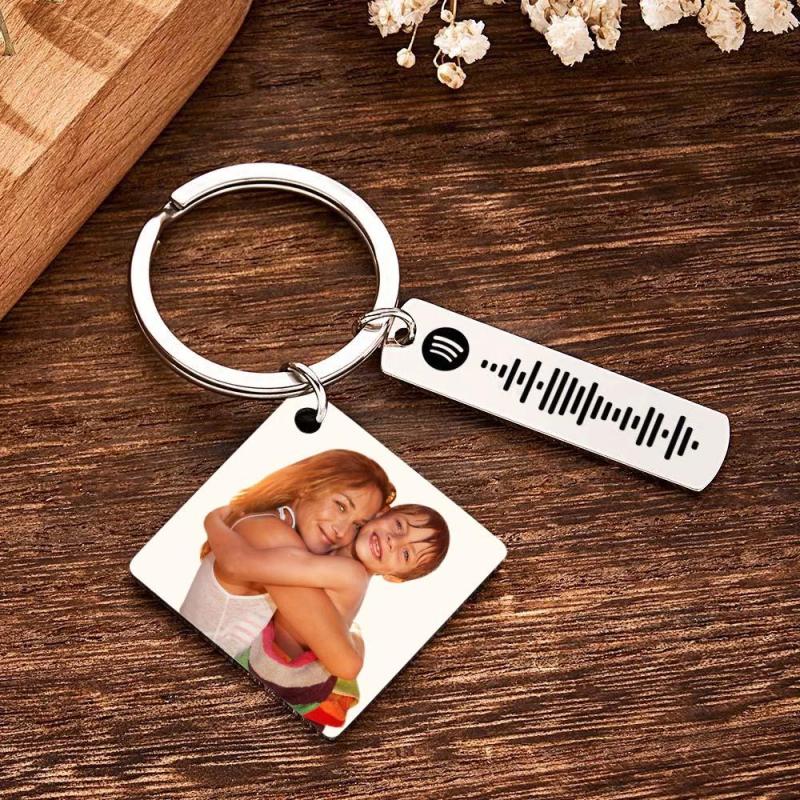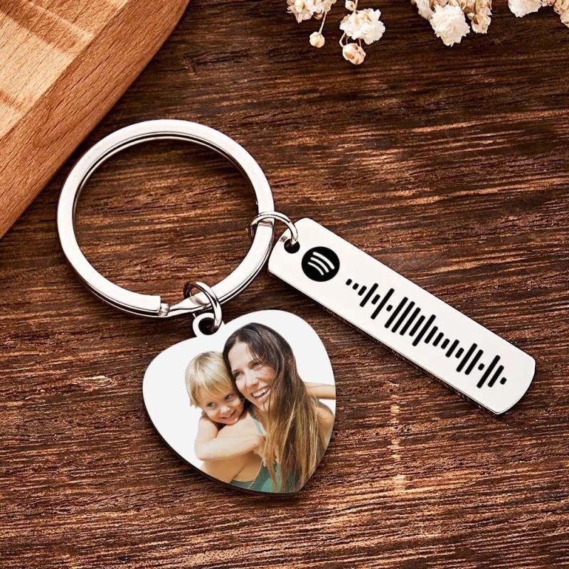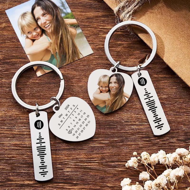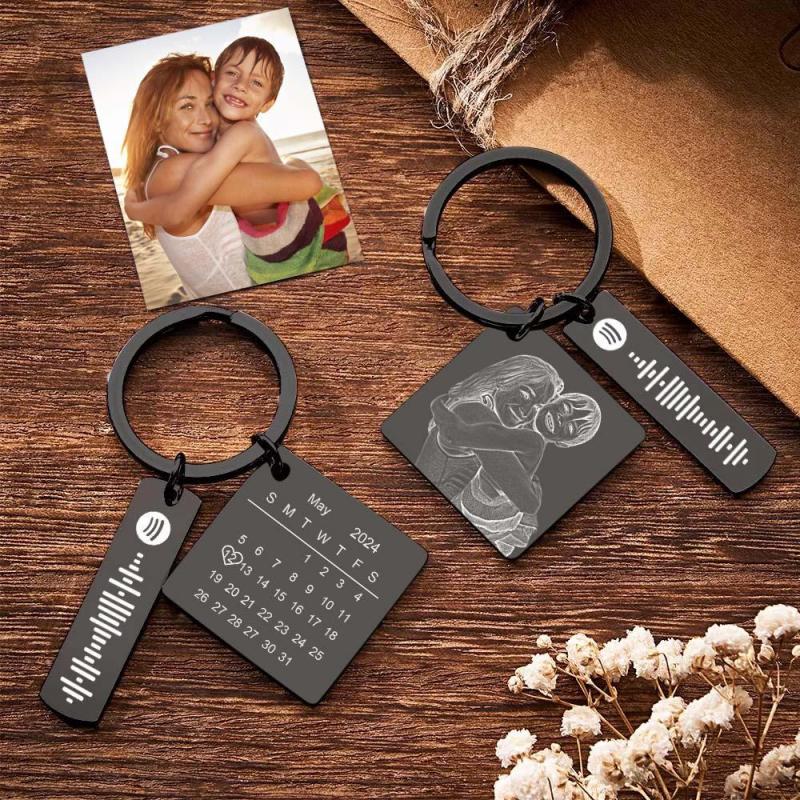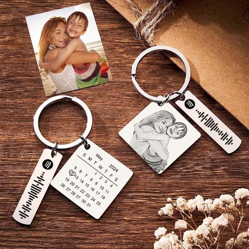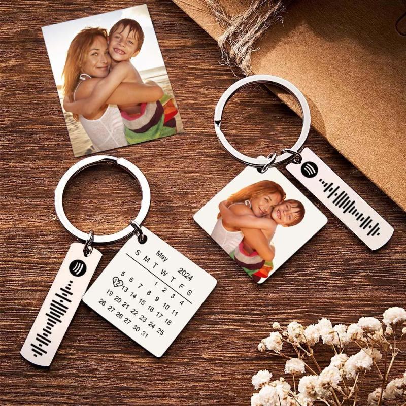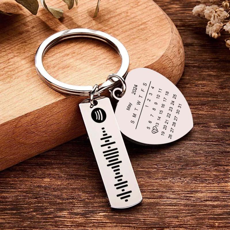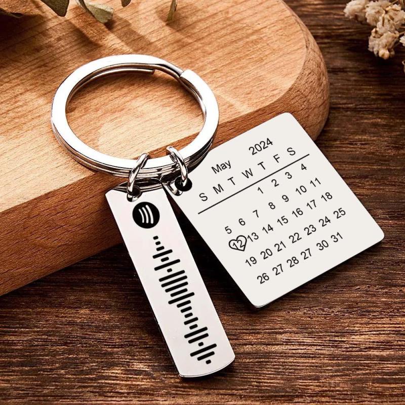 Notre porte-clés calendrier personnalisé est un cadeau unique et sentimental parfait pour commémorer des occasions spéciales. Fabriqué en acier inoxydable de haute qualité, ce porte-clés en forme de cœur présente une photo significative et un texte personnalisé. Le code musical de forme carrée ajoute une touche de personnalisation. Disponible en argent, or, or rose, noir et couleurs, ce porte-clés est un cadeau d'anniversaire idéal. Commandez maintenant et offrez à votre bien-aimé un souvenir précieux.