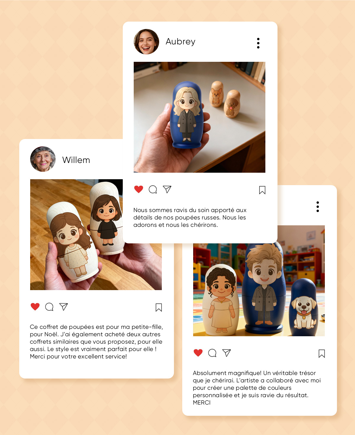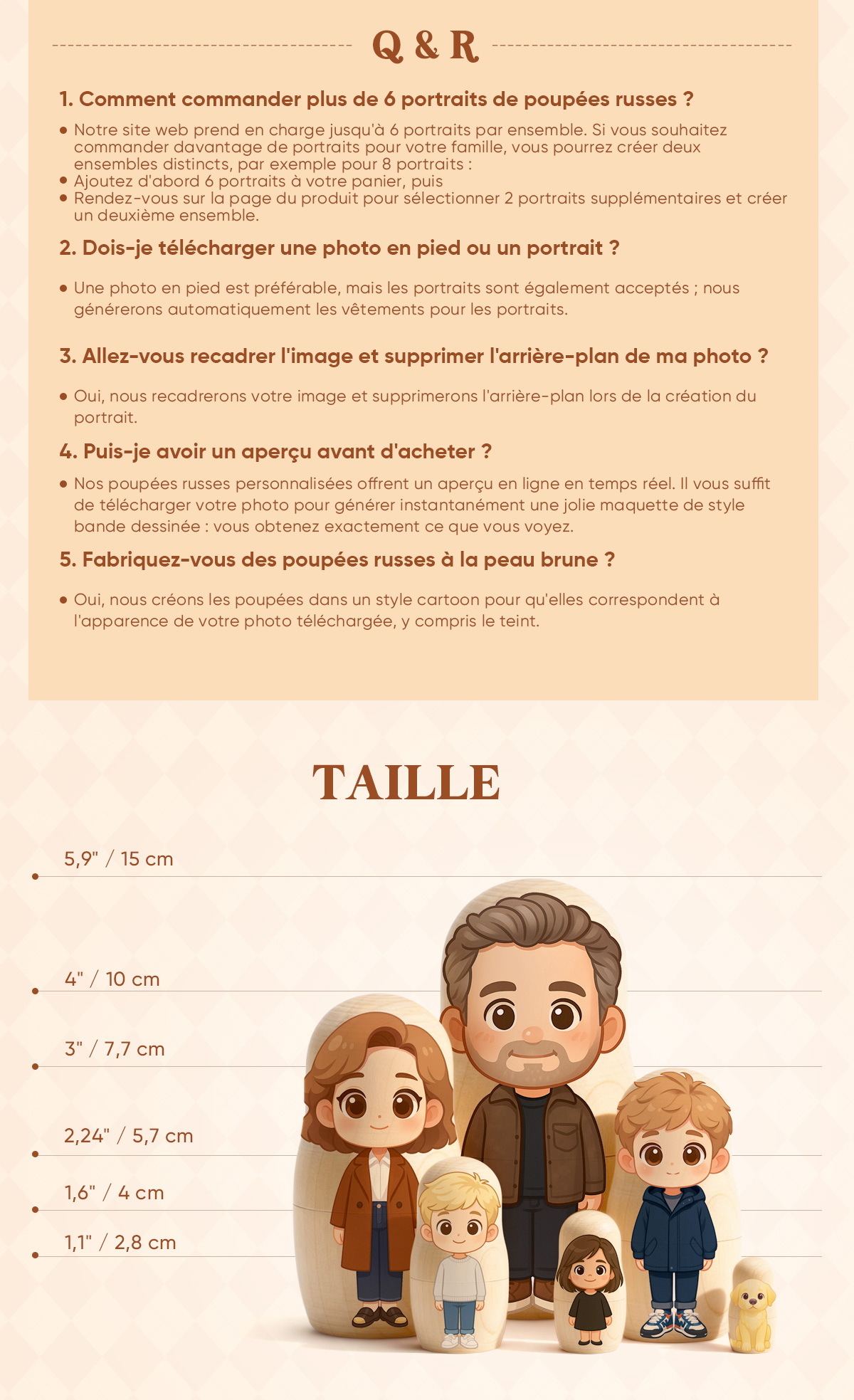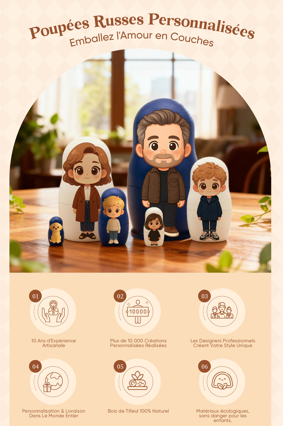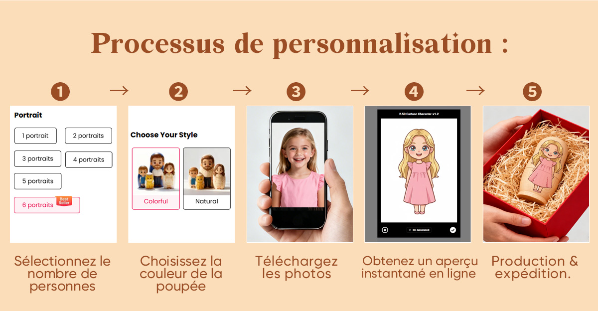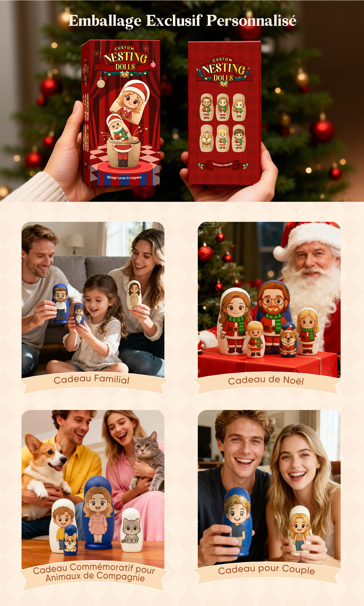 Apportez joie et créativité à votre sapin de Noël avec cette poupée gigogne personnalisée style dessin animé. Chaque mini-poupée présente un portrait cartoon réalisé à la main à partir de votre photo — transformant vos proches en adorables personnages illustrés, pleins de chaleur et de personnalité.