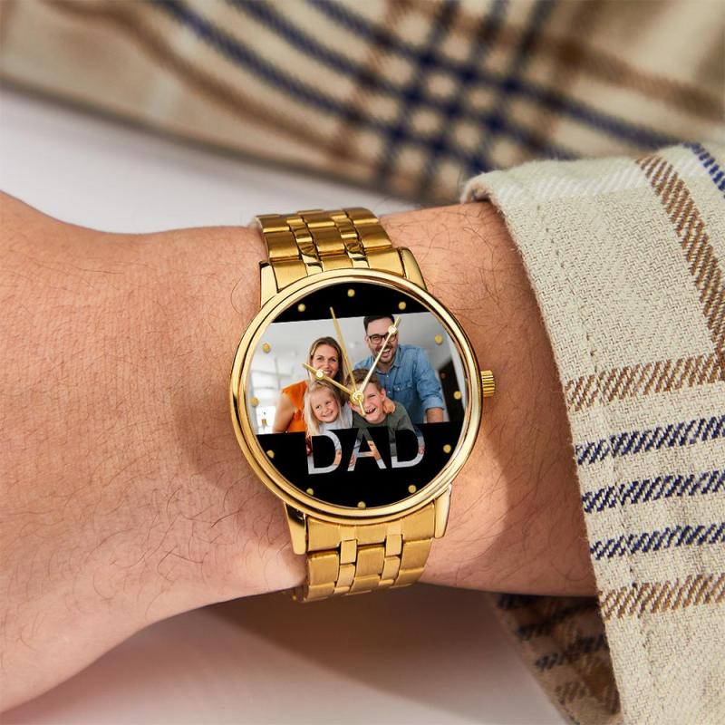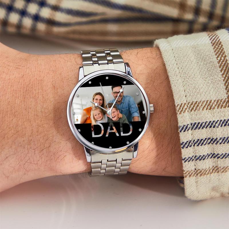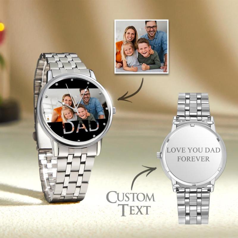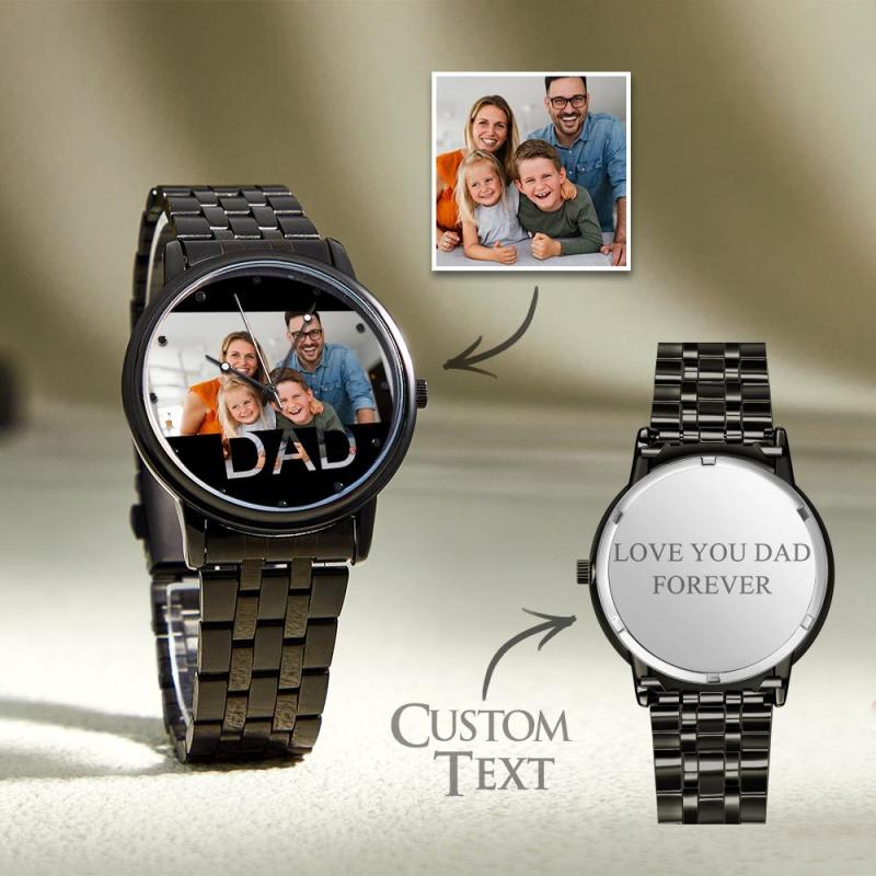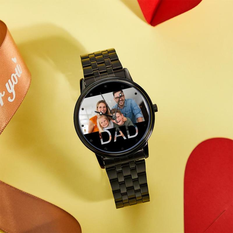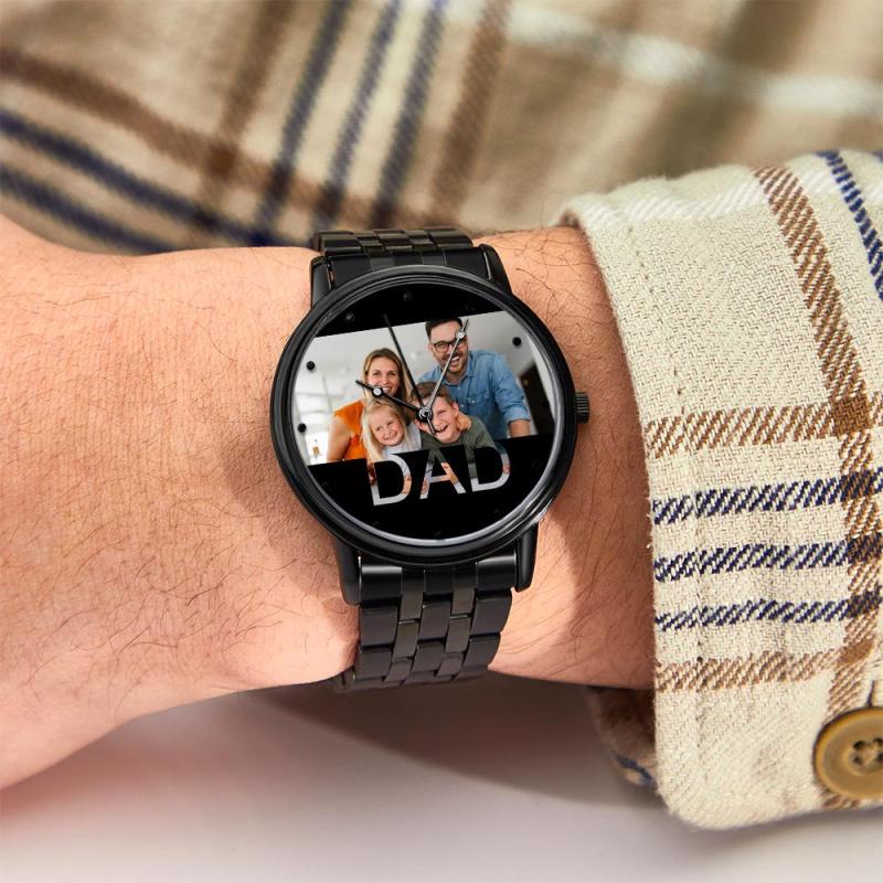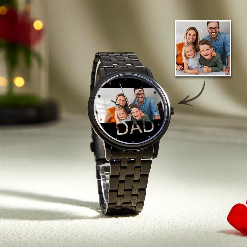 Montre Photo Gravée Personnalisée Cadeaux De Fête Des Pères Bracelet En Alliage Noir Pour Hommes Montre Photo À Papa