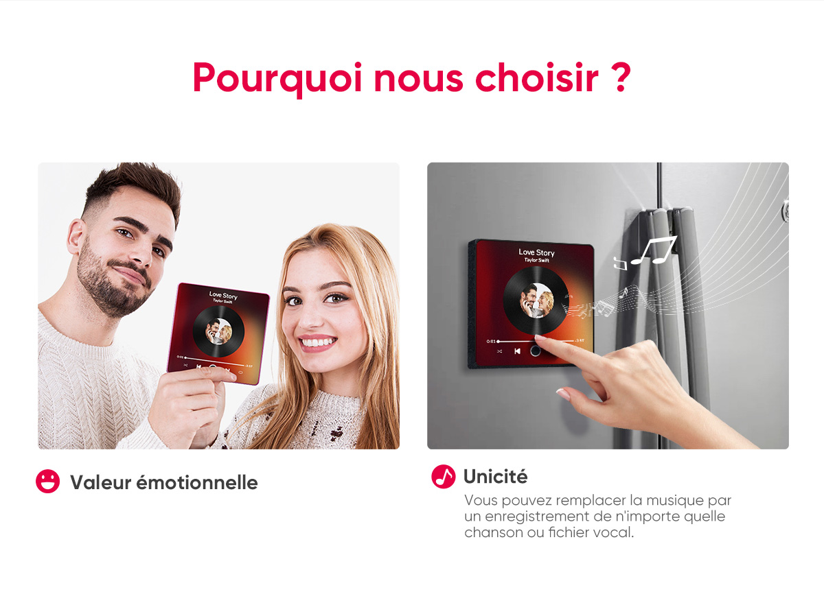 Musique personnalisée : Sélectionnez des chansons d'amour romantiques ou vos mélodies préférées, module de musique personnalisé DIY, de sorte que chaque fois que la porte du réfrigérateur est ouverte, elle sera accompagnée de la mélodie de votre amour. Si vous le souhaitez, vous pouvez même remplacer la musique de l'aimant du réfrigérateur par n'importe quelle chanson de votre choix ou par un enregistrement de votre propre voix. Pour obtenir des instructions détaillées sur la façon de procéder, veuillez contacter notre service client. Nous avons un tutoriel dédié à votre disposition.
