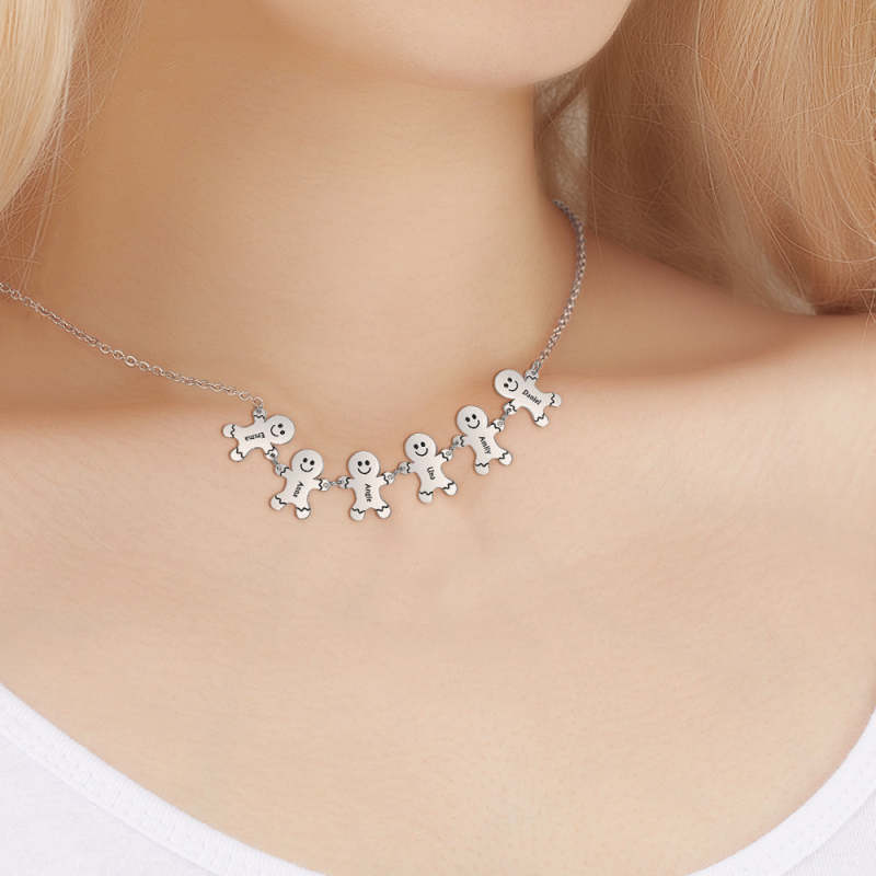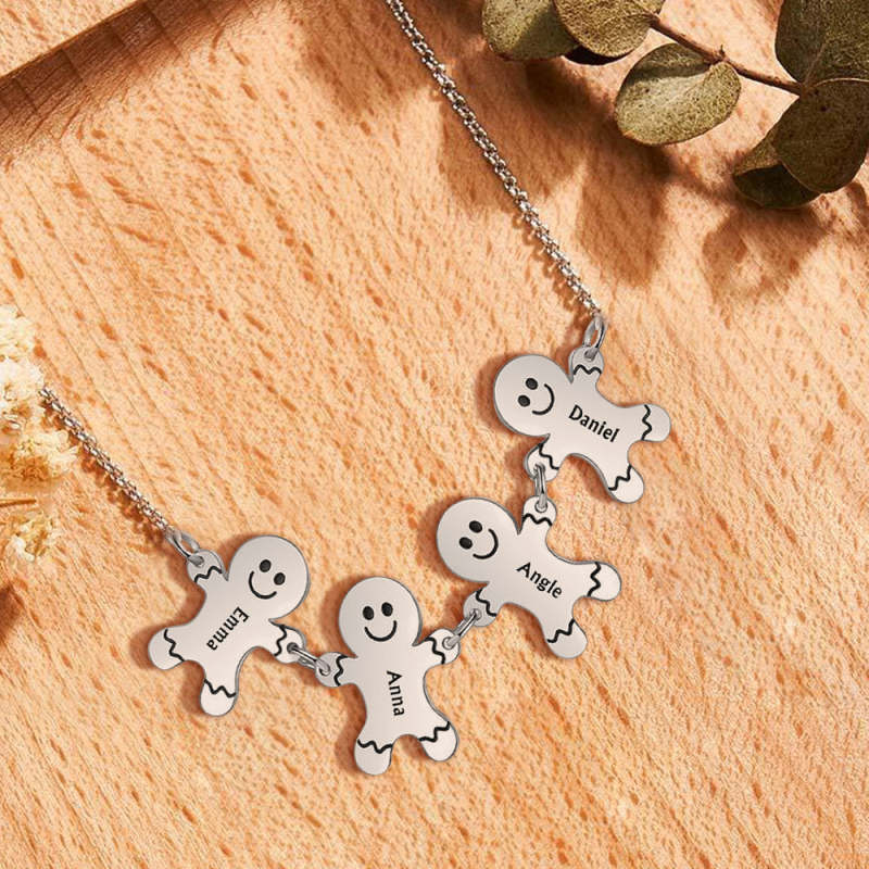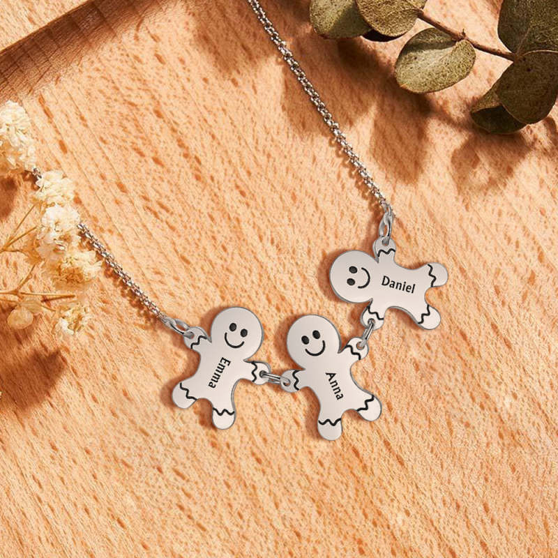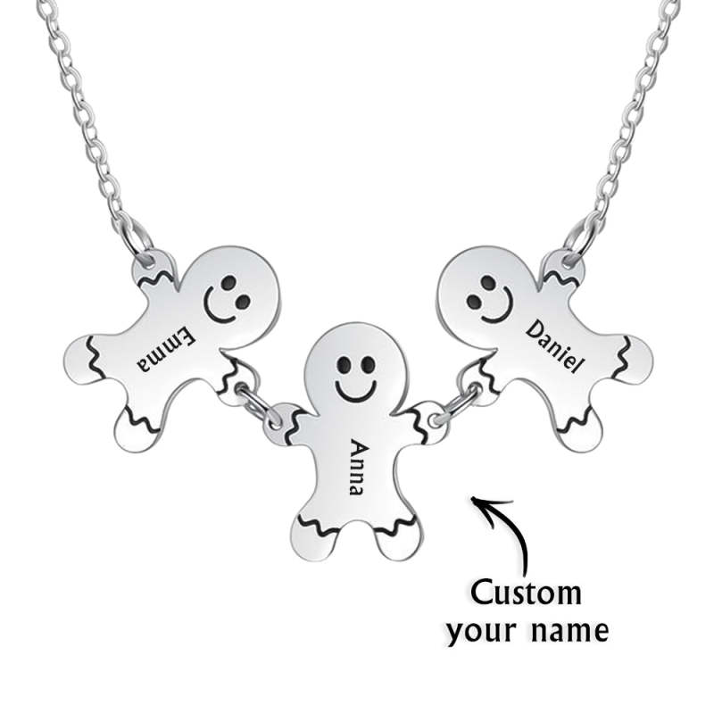Personnalisez les pendentifs bonhommes en pain d'épices avec les noms des enfants, les noms d'autres membres de la famille, les noms d'amis, les noms d'animaux de compagnie, etc. C'est un cadeau unique et merveilleux pour les mères, les grands-mères, les filles, les sœurs, les collègues et les meilleurs amis. C'est un joli cadeau pour les anniversaires, les remises de diplômes, la Saint-Valentin ou les anniversaires.