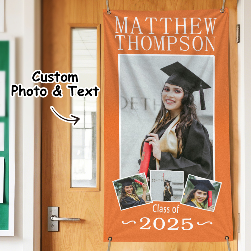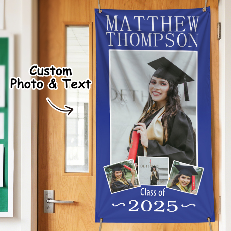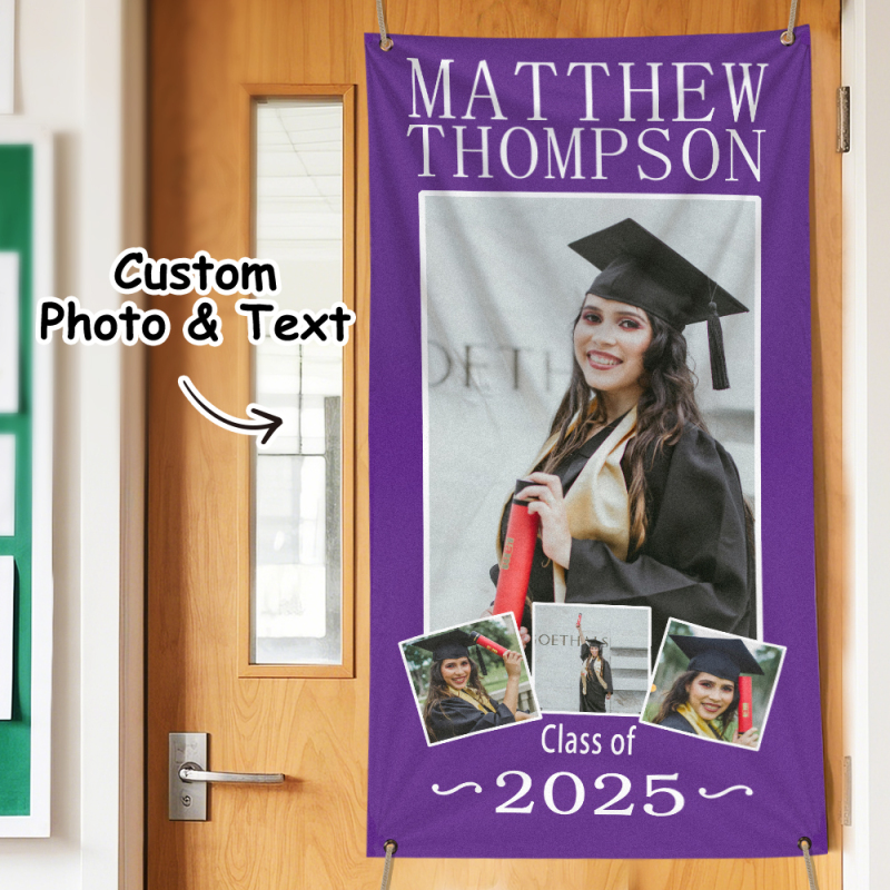 Célébrez votre réussite avec notre bannière photo de remise de diplôme personnalisable. Conçue pour mettre en valeur votre plus grand moment de fierté, cette bannière « Photo de réussite » est une décoration d'intérieur mémorable ou un cadeau de remise de diplôme. Personnalisez-la avec votre photo et votre message pour créer un souvenir unique qui honore votre parcours et votre réussite.