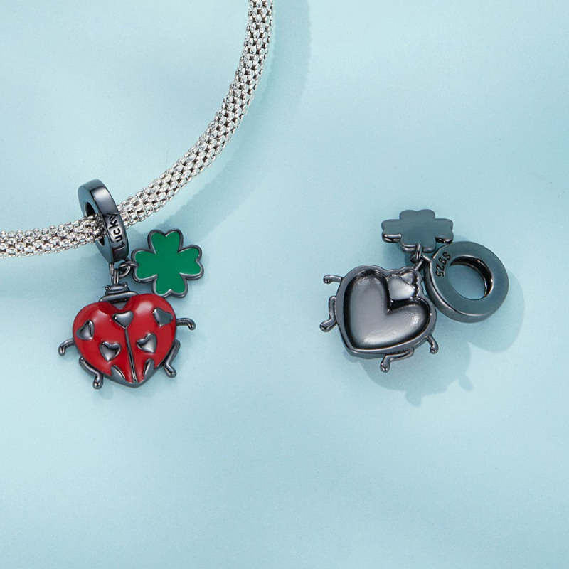 Charm Pendentif Coccinelle Rouge Et Trèfle À Quatre Feuilles Argent